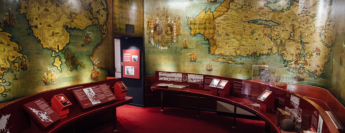 This room has a striking map depicting Sweden at the height of the nation’s political power. Painted on bronze leaf by Sten Nilsson in 1938 the “golden map” features vignettes of everyday life in Sweden and its dominions during the early 1600s.